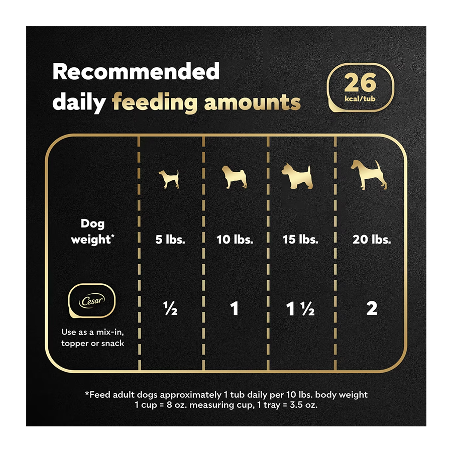Daily Amount: Feed up to one tub per 10 lbs of dog body weight