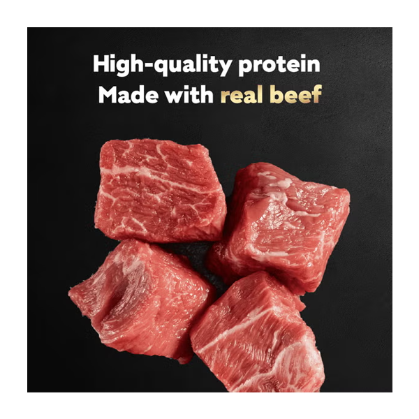 Prime Rib Flavor: Water, Chicken, Chicken Liver, Beef, Animal Plasma, Wheat Gluten, Chicken Heart, Corn Starch, Wheat Flour, Dried Plain Beet Pulp, Salt, Potassium Chloride, Calcium Carbonate, Choline Chloride, Sodium Tripolyphosphate, Added Color, Magnesium Proteinate, Zinc Sulfate, Xanthan Gum, DL-Methionine, Prime Rib Flavor, Guar Gum, Manganese Sulfate, Vitamin E Supplement, Sodium Carbonate, D-Calcium Pantothenate, Biotin, Copper Sulfate, Thiamine Mononitrate (Vitamin B1), Riboflavin Supplement (Vitamin B2), Potassium Iodide, Vitamin A Supplement, Pyridoxine Hydrochloride (Vitamin B6), Vitamin B12 Supplement, Vitamin D3 Supplement.